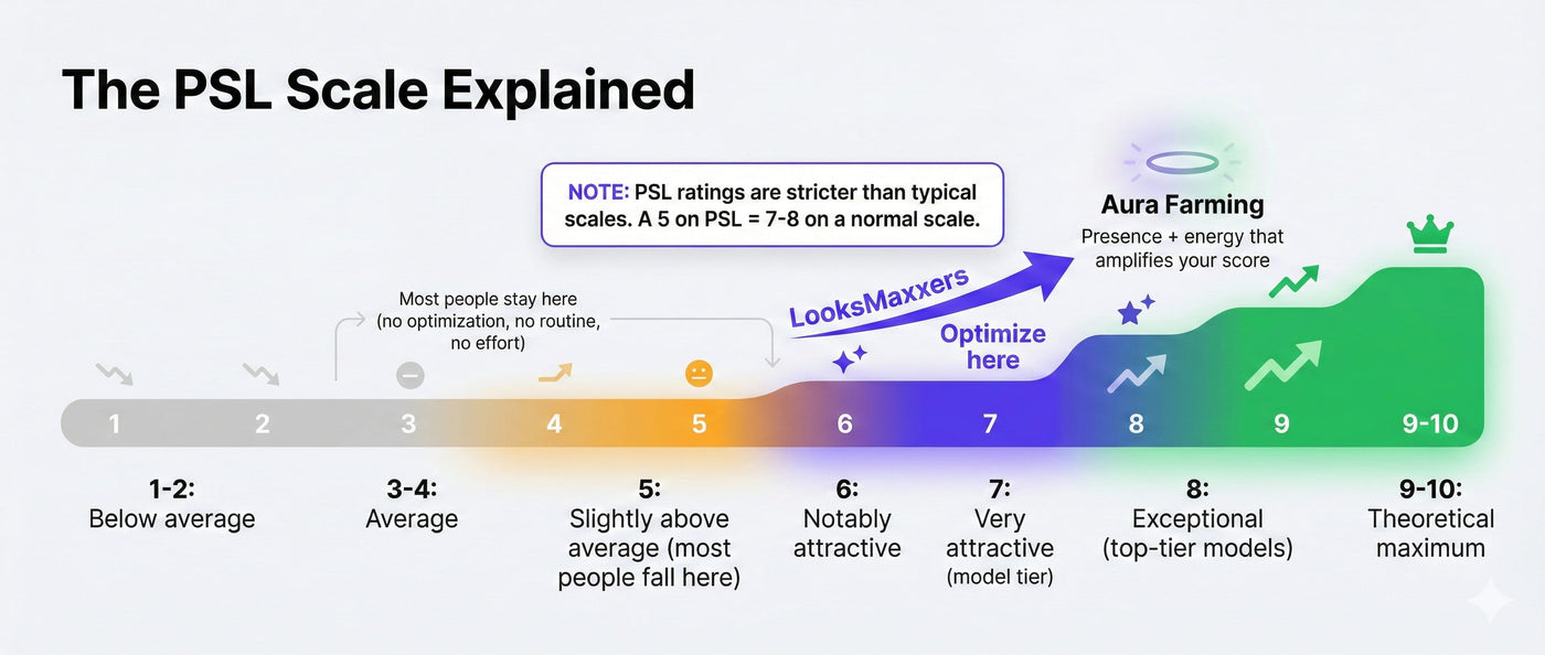 The PSL Scale is how the looksmaxxing community measures attractiveness — and it's stricter than you think. A PSL rating of 5 equals a 7-8 on a normal scale. Most people stay stuck in the 3-5 PSL score range without consistent optimization. LooksMaxxers helps you increase your PSL rating into the 6-8 zone through training, recovery, skincare, and lifestyle habits. Want the full breakdown? Read the complete PSL Scale explained guide.