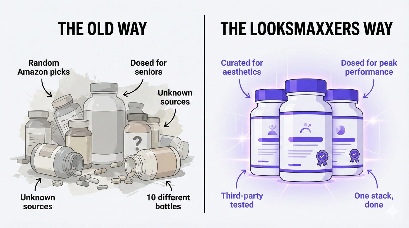Most supplements aren't built for looksmaxxers actively optimizing their appearance. They're dosed for aging adults worried about joint pain and bone density — not people in their peak years focused on training, recovery, skincare, and physique.